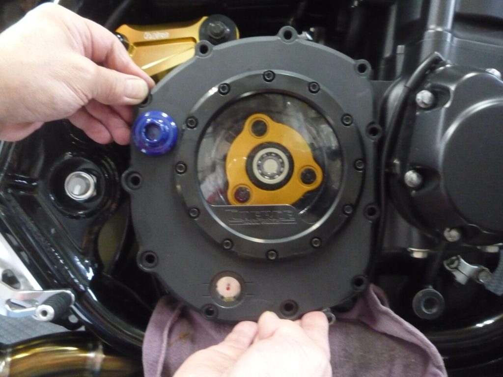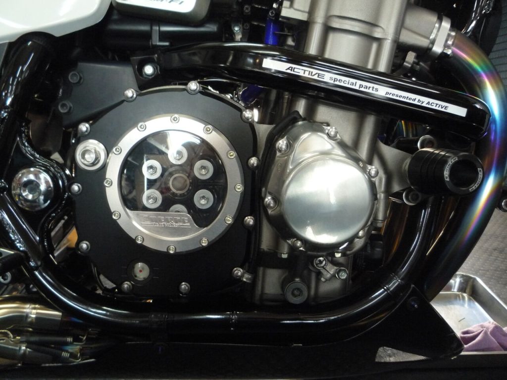 クラッチカバーを留めるボルト類もカスタムでブルーのチタンボルトにされるなど